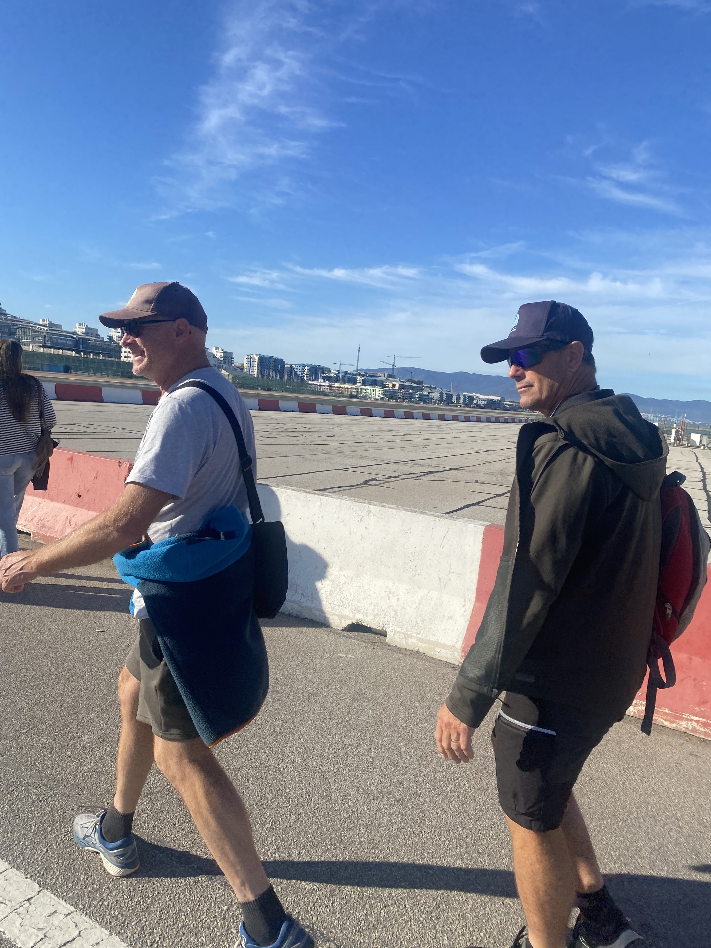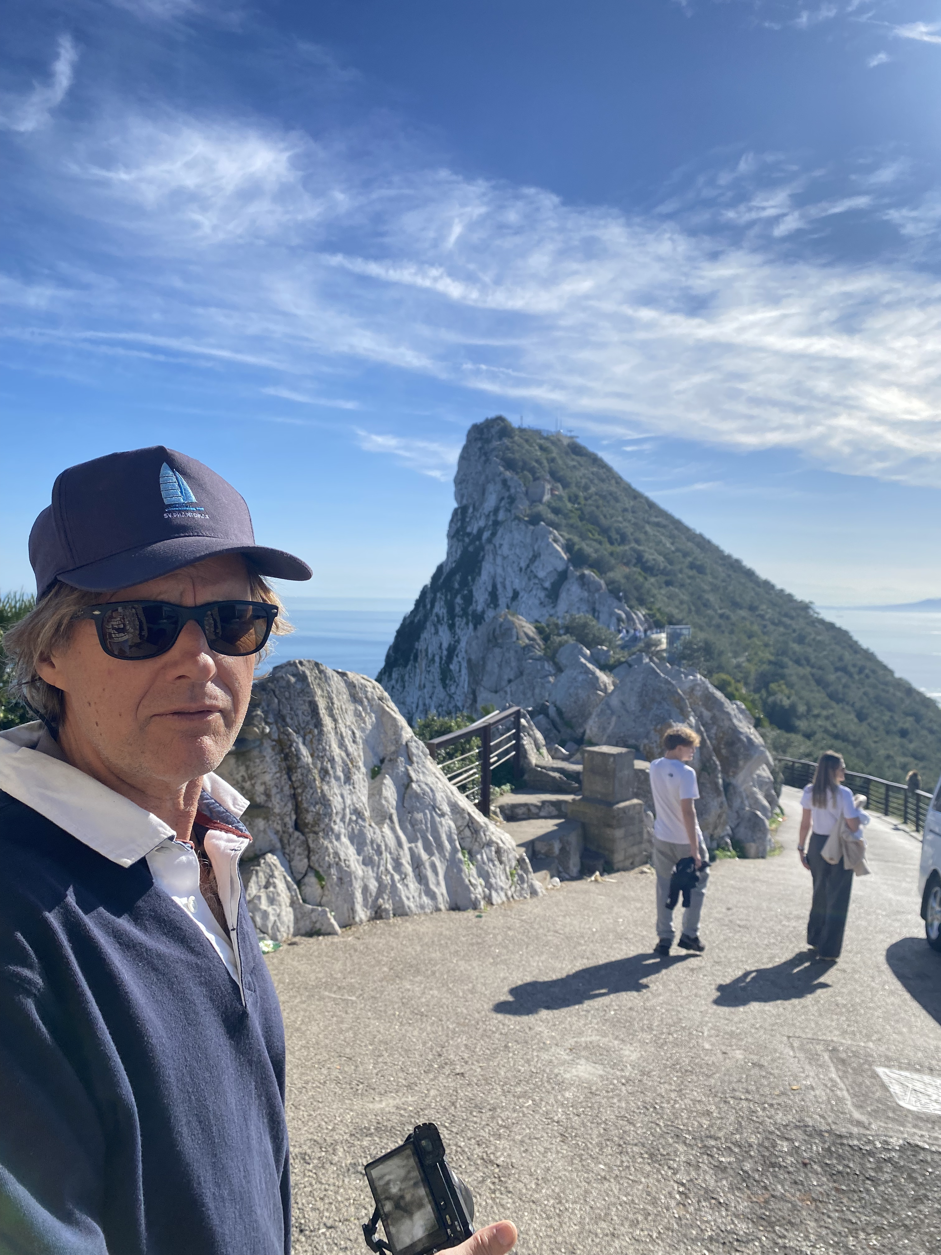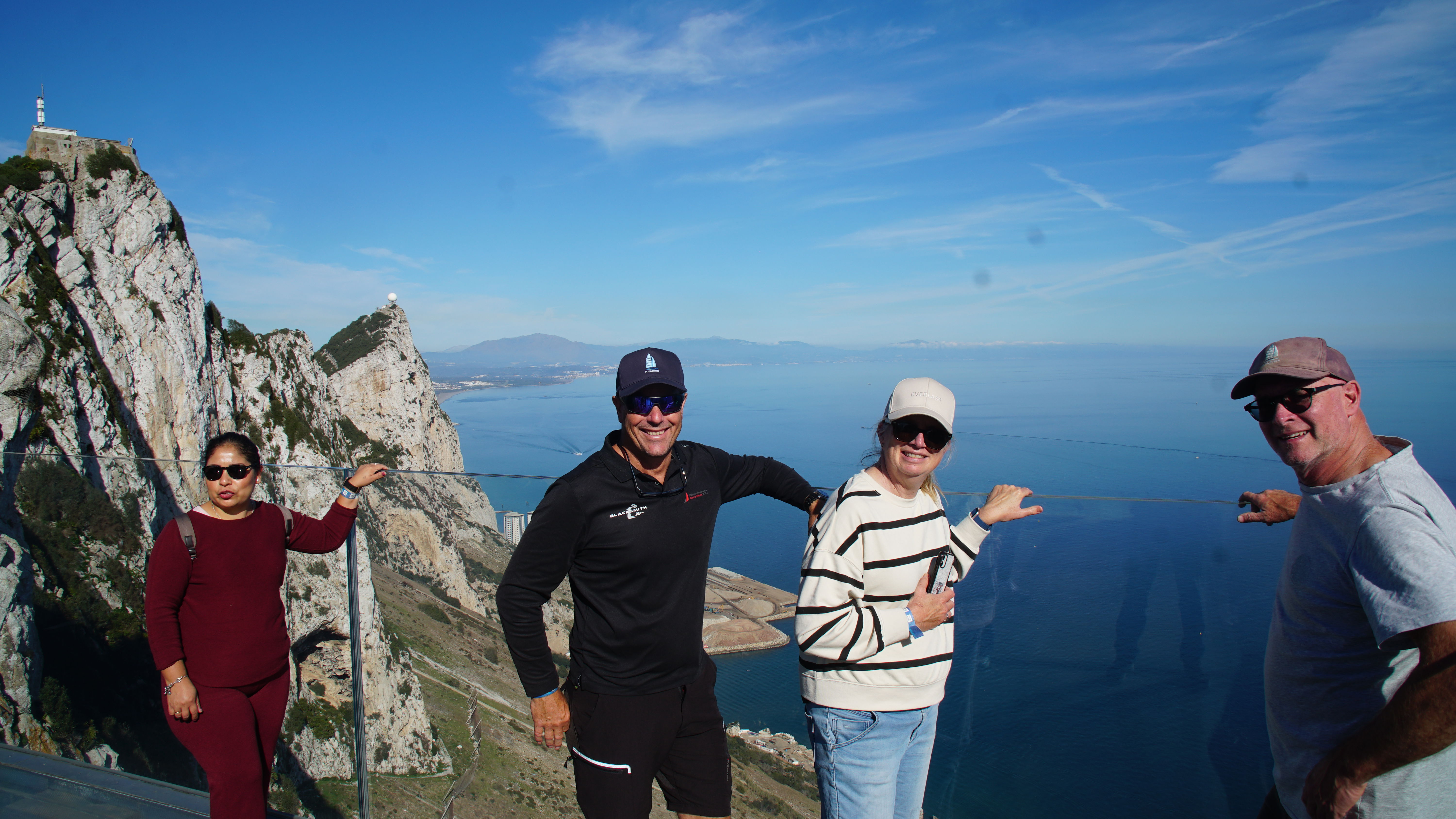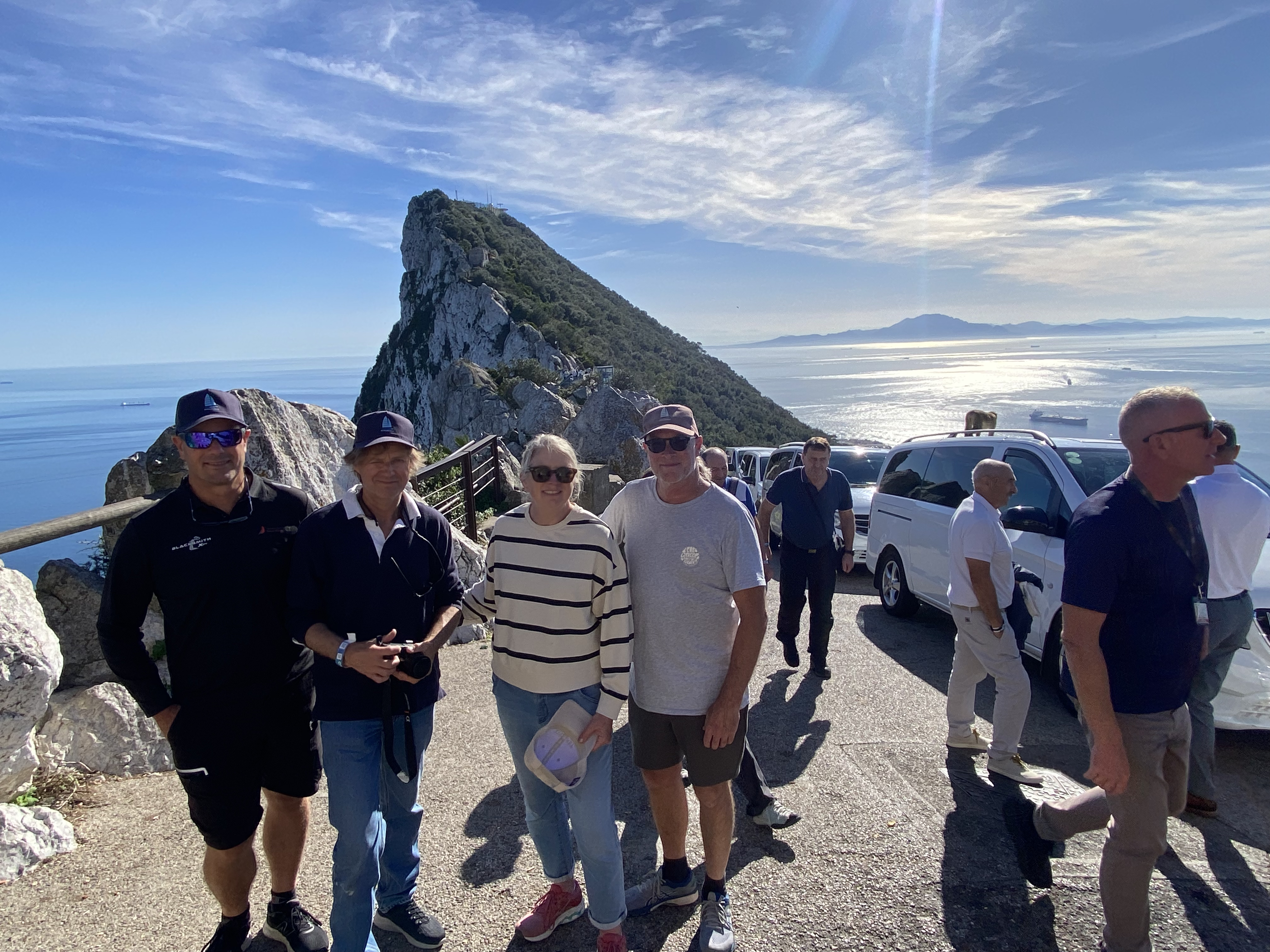 With half the crew, Tim & Campbell having arrived on Sunday we took the opportunity on Monday to walk across to Gibraltar. We did have to stop at the tarmac gate as two planes were taking off before they let the crowds cross. We found a taxi driver, which is the best way to see the rock, who was a born and bred Gibraltarian to take us on a tour up the rock. There were a number of amazing vantage points with views from Spain to Africa and our driver kept an interesting running commentary on some history and points of interest. The monkeys on the rock are a real thing, and our driver was familiar with quite a few of them and they would sit on his car door and he would pat them. Their eyes were going everywhere, checking out what they could pinch from his dashboard. He just managed to save his packet of mints.